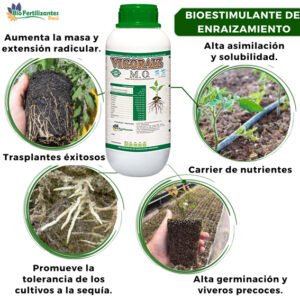 Bioestimulante/antiestresante y corrector de suelos de origen biológico para el desarrollo continúo de raíces y brotes con efectividad en los diversos cultivos, especialmente diseñado para la aplicación en sistemas de riego tecnificado.
