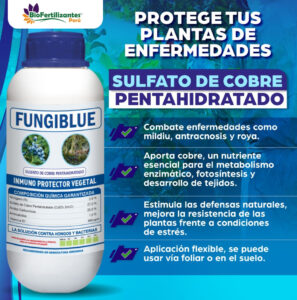 FUNGIBLUE SULFATO DE COBRE PENTAHIDRATADO nutre las plantas por su alto contenido de cobre, corrige deficiencias de cobre; además tiene acción preventiva sistémica contra hongos y demás patógenos (bacterias, hongos, etc.). Se absorbe por las hojas y se transporta a toda la planta, raíces, tallos, hojas y frutos. EL cobre actúa en procesos enzimáticos que ACTIVAN EL SISTEMA INMULOGICO VEGETAL (SAR). Inhibe la propagación de enfermedades. .